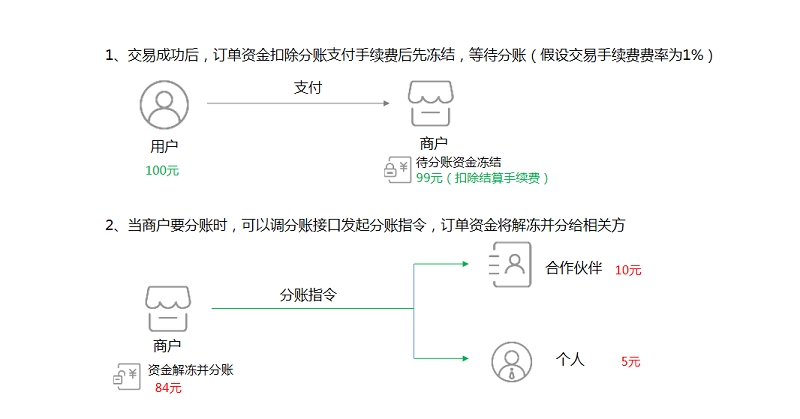 微信分账:https://pay.weixin.qq.com/wiki/doc/api/allocation.php?chapter=26_1 支付宝分账: https://opendocs.alipay.com/open/20190308105425129272/intro